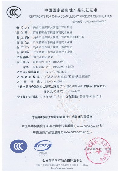 熱烈慶祝鶴山市恒保防火玻璃廠有限公司取得3C防火窗證!