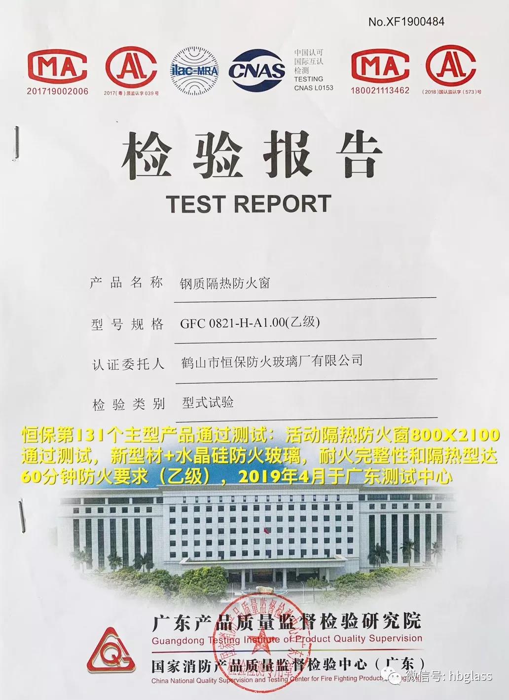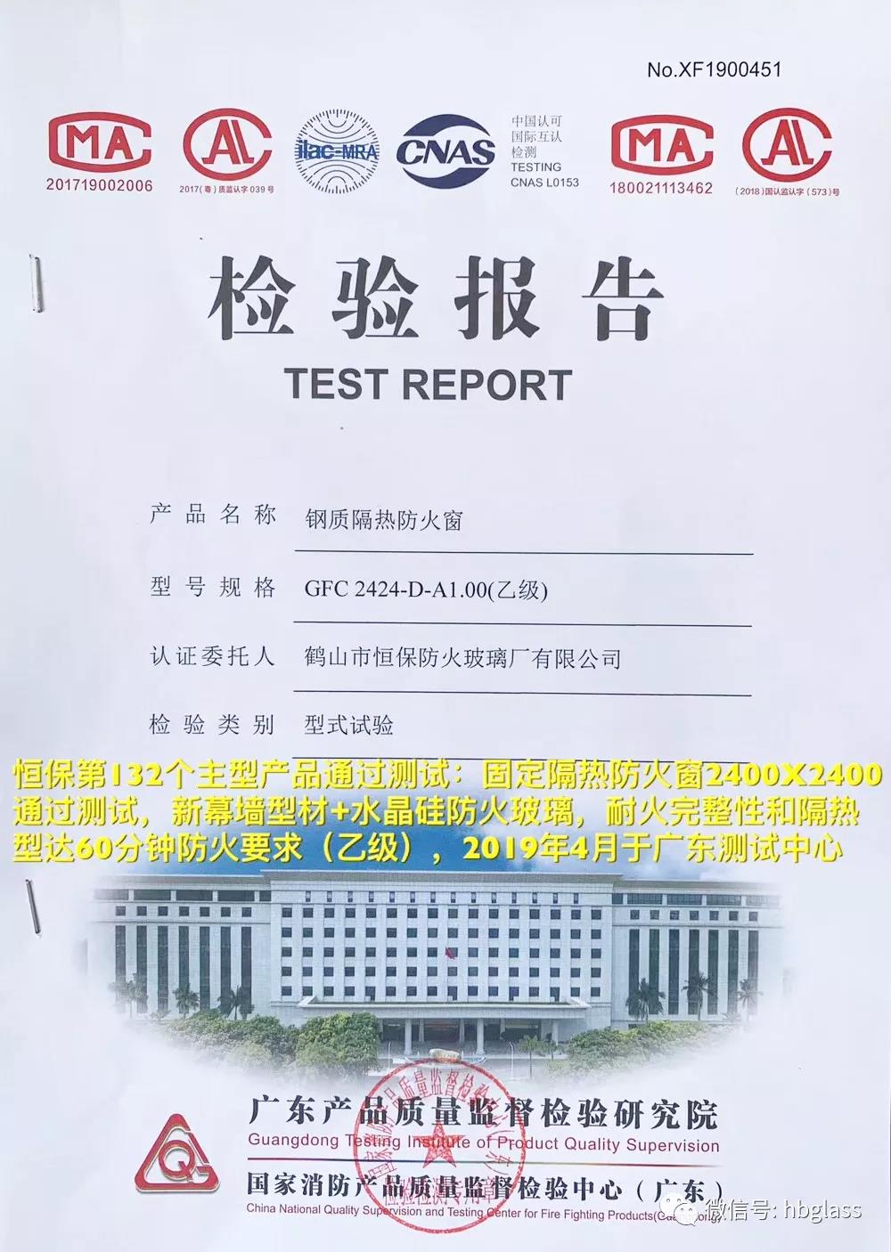恒保第132個主型產(chǎn)品通過測試:2019年4月于廣東測試中心,恒保公司送檢的固定隔熱防火窗(2400X2400,新幕墻型材+福普思水晶硅防火玻璃),通過耐火完整性和隔熱型達(dá)60分鐘防火要求(乙級)測試要求,并獲得檢測合格報告。國家強制性CCC認(rèn)證證書正在申請中。
