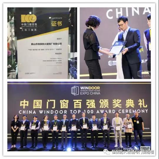 同期3月5日上午,由鋁門窗幕墻新產品博覽會、中國房地產業與門窗幕墻聯盟、中國建筑金屬結構協會鋁門窗幕墻委員會等單位聯合評審,經過多家地產商和業主的選材經驗共享認可,鶴山恒保公司獲得“中國門窗百強工程門窗類(2018-2019)榮譽稱號”