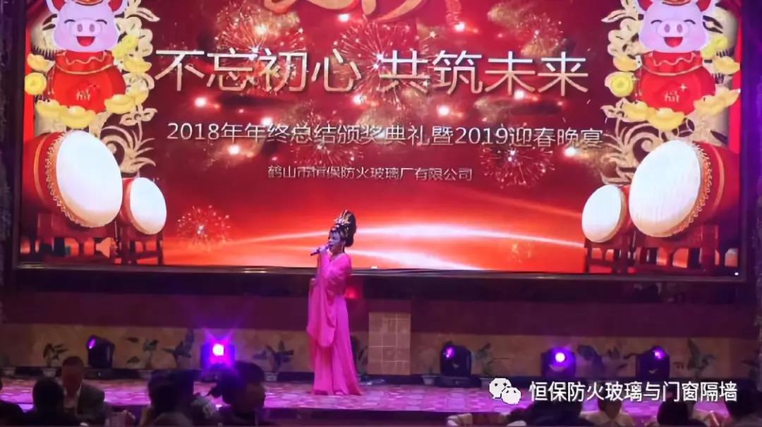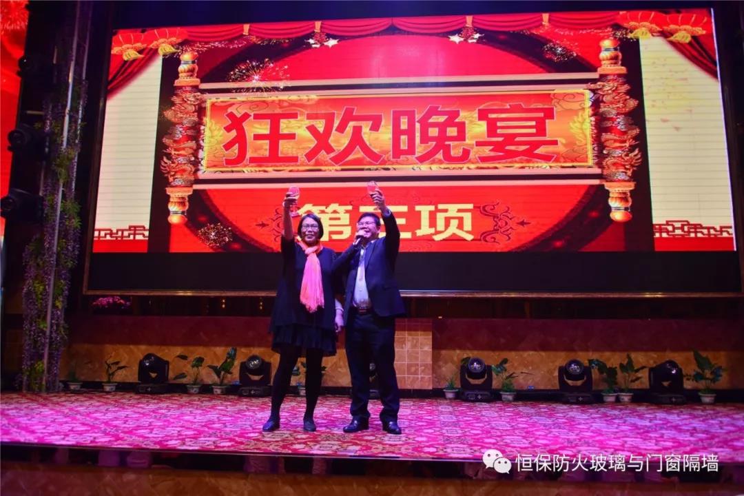 19:30分,恒保年會在鼓舞飛揚中拉開了帷幕,首先是恒保總經理陳沃林先生做年終致辭,陳總回顧了2018年所取得的成績與不足,并提出了2019年恒保要全力以赴,不忘初心,繼續奮斗,再創佳績的戰略方針。2018年是恒保跨越發展的一年。全體恒保家人,團結一心,艱苦奮斗,全力實現了公司既定的年度目標,同比各項重要指標增長逾80%。2018年我們大力引進新設備,開發新產品10多項,產品通過國家檢測20多項 ,至此,恒保出品已擁有37個3C認證,158份檢驗報告,成為行業內公認通過國家檢驗、認證最多的防火玻璃門窗企業;2018年在行業各類權威獎項評比中,榮獲“全國鋁門窗幕墻展 年度星品獎”、榮獲“新玻網 門窗玻璃十強企業”、陳沃林總經理榮獲鶴山市工商聯系統“工匠之星”稱號、陳沃林總經理榮獲第五屆中國玻璃行業“玻璃工匠”稱號、榮獲第三屆建筑門窗金軒獎“最具創新力配套產品”、榮獲第三屆建筑門窗金軒獎“最具發展潛力企業”、榮獲中國門窗幕墻行業“科技進步推動獎”等十多項獎項。2019年我們將持續優化各部門管理,提高員工工作技能、提高生產管理水平、提高生產效率、提高綜合管理能力,減少物料損耗,減少出錯率。加強精密型材、新型防火門窗的開發,滿足不同客戶的需求。2019年恒保上下一心、同心協力、不忘初心,共筑未來,為實現中國平安夢、世界平安夢繼續奮斗!