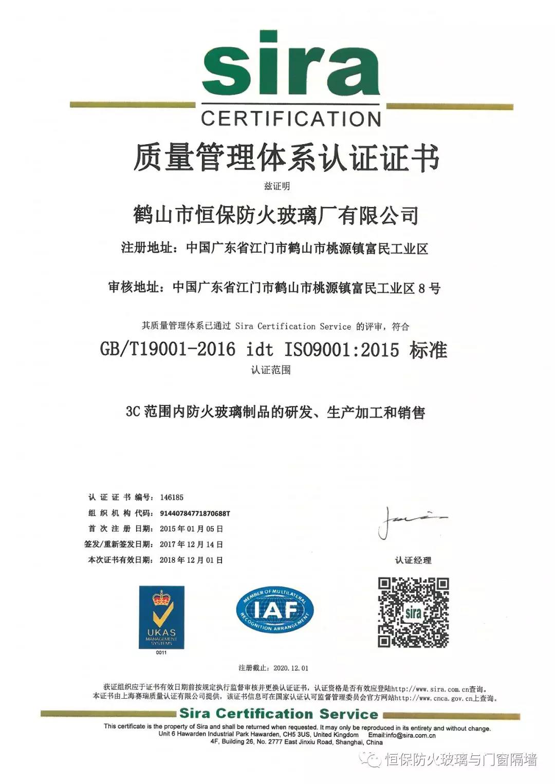 鶴山市恒保防火玻璃廠有限公司,自2014年第一次獲得ISO9001-2008質(zhì)量管理體系、ISO14001-2008環(huán)境管理體系認(rèn)證。并與原企業(yè)管理體系相結(jié)合,與CCC強(qiáng)制性認(rèn)證產(chǎn)品企業(yè)管理體系相融合,建立了更完善的科研、開發(fā)、生產(chǎn)、銷售和售后服務(wù)體系,使恒保公司穩(wěn)健快速增長。
