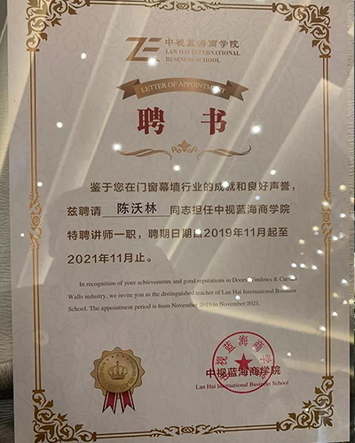 同期11月5日,恒保再獲中國門窗百強企業稱號!而恒保總經理陳沃林先生成為中視藍海商學院的特聘講師!