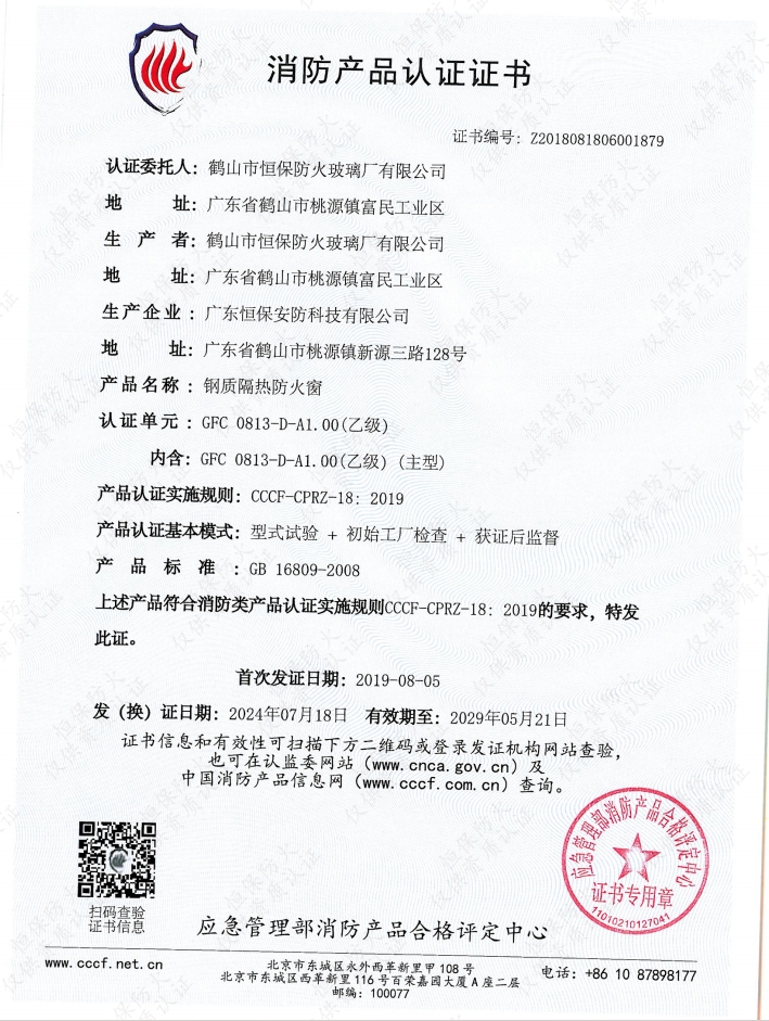 乙級固定防火窗消防產(chǎn)品認證證書: