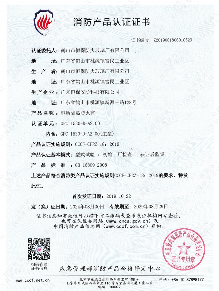 甲級固定防火窗消防產(chǎn)品認證證書: